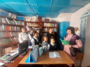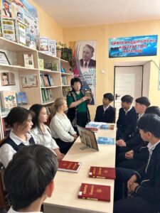 Жуалы ауданы Жетітөбе ауылдық округі Қоңыртөбе ауылдық кітапханасында №21 Дмитрий Пахомов атындағы орта мектебінің 9-10 сынып оқушыларының қатысуымен кітапханашы К.Айтбаева «Жаңа заманның ерлік шежіресі» атты кітап шолуын ұйымдастырып, оқушыларды кітап оқуға шақырды.